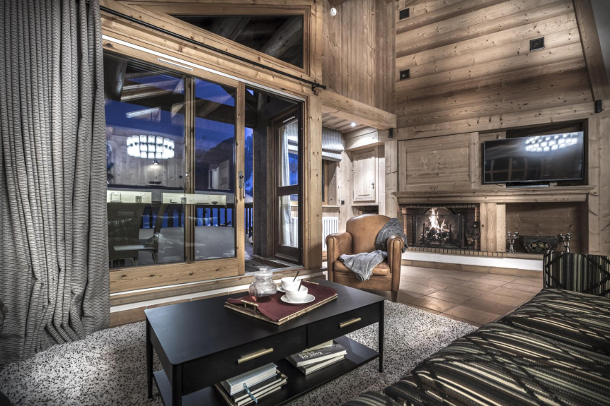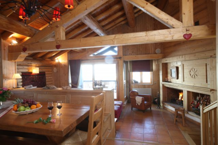 Il salone doppio è la stanza più piacevole dello chalet: le grandi panche ricoperte di kilim permettono di godere del caminetto, il salone si apre su una terrazza che offre una vista magica sulla valle dell'Iseran, senza alcun opposto.