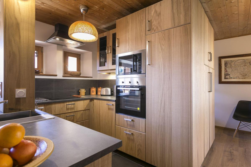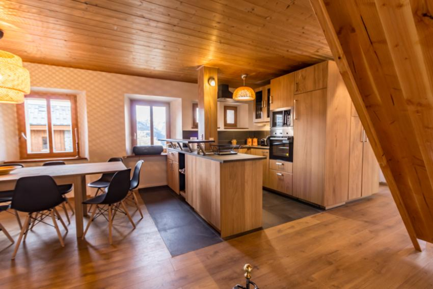 Cucina aperta completamente attrezzata (lavastoviglie, grande frigorifero, forno, microonde, mixer, macchine per raclette e fonduta...)