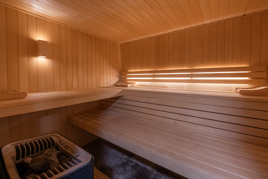 Area benessere con sauna per 5/6 persone, hammam per 4/5 persone, cabina a infrarossi per 2 persone, doccia, sala riposo e tisaneria, da luglio 2015