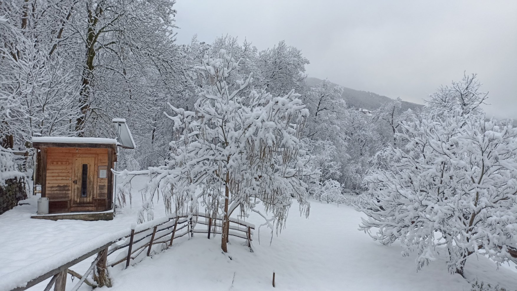 La sauna dello chalet con illuminazione solare in mezzo al giardino e fuoco a legna. Una brocca per rinfrescarsi con acqua ghiacciata del "bachal" (abbeveratoio del villaggio).