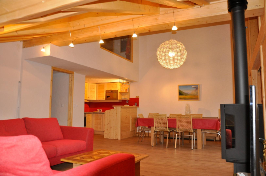 Composto da una cucina aperta adiacente al soggiorno di 45 m² con tavolo per 10 persone, 2 divani, 1 tavolo da gioco, 1 TV di 101 cm, una stufa a legna, Wi-Fi box gratuito
