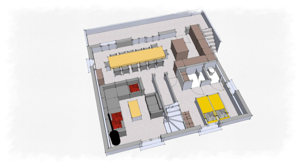 Al primo piano, un grande salone con una cucina moderna, un grande tavolo conviviale, un caldo salone con una stufa a pellet o un camino vi invitano a incontrarvi con la famiglia o gli amici.