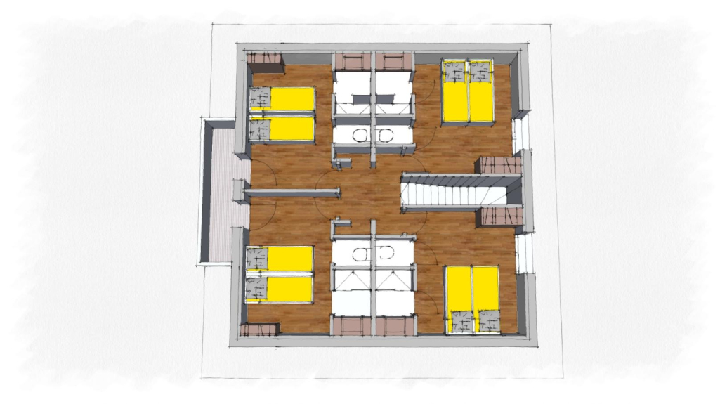 Ogni chalet ha 5 camere doppie con 2 letti singoli e una camera familiare con 2 letti singoli e 2 letti a castello.