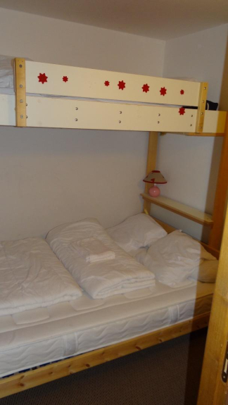 Camera da letto 2 con letto matrimoniale e letto singolo sul soppalco con piumino.