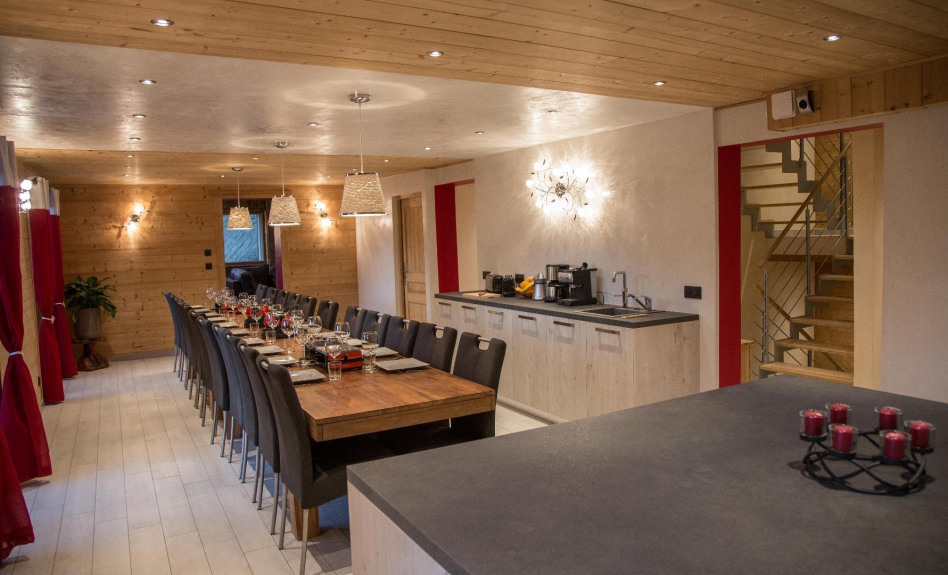 - 1 grande cucina completamente attrezzata con sala da pranzo, tavoli e sedie per 20 persone (45m²), che si apre sulla terrazza (tavoli, sedie, barbeque) con vista sul lago, le sue montagne e la sua posizione sud-ovest