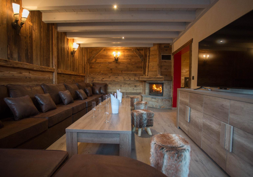 - 1 grande soggiorno/sala TV (24 m²) molto accogliente, tutto in legno antico con il suo camino e il suo accesso diretto alla terrazza dove si trova la jacuzzi per 6 persone.