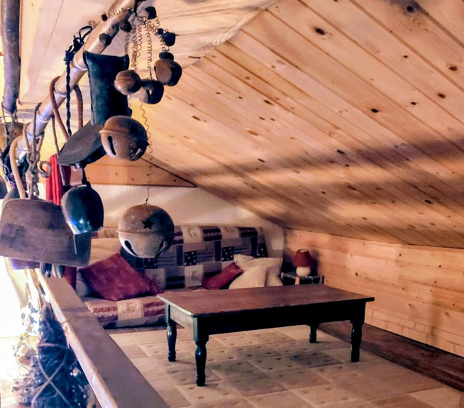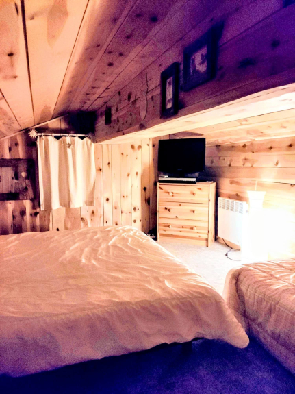 Al secondo livello c'è una zona televisione e giochi sul mezzanino e una camera da letto (15m2) sotto il tetto (altezza 1m50) con letti sul pavimento.