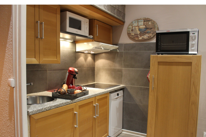Zona cucina: forno, microonde, frigorifero, piano cottura a induzione, lavastoviglie, macchina da caffè Senseo