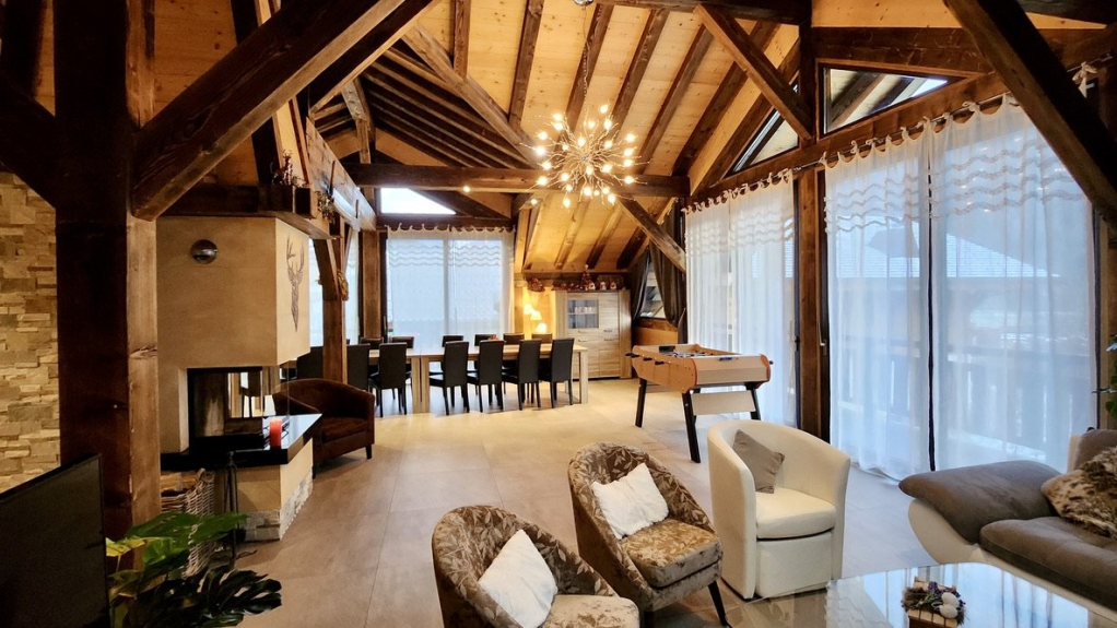 Lussuoso soggiorno con grande camino rustico rivestito in pietra e legno e con BABYFOOT, molto luminoso con le sue grandi finestre. Connessione WIFI.