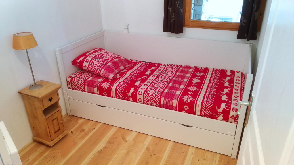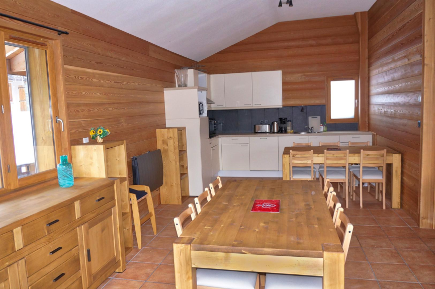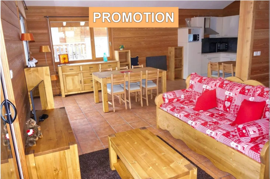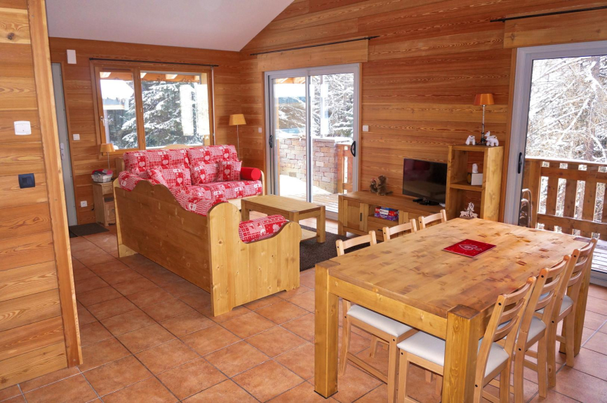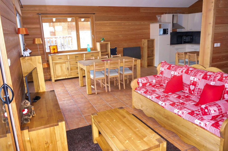 Chalet di 96m² su 2 livelli, soggiorno molto ampio con balcone con vista sul parco della Vanoise. Lo chalet può ospitare da 12 a 14 persone.