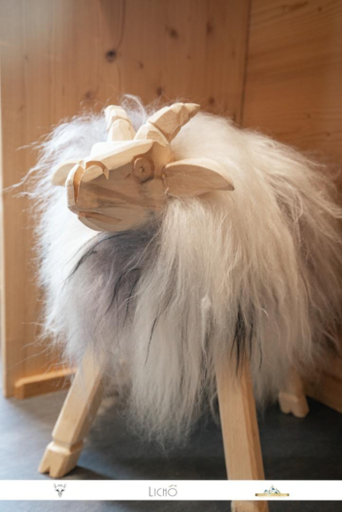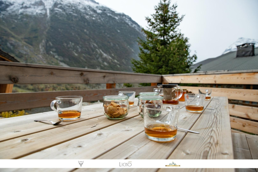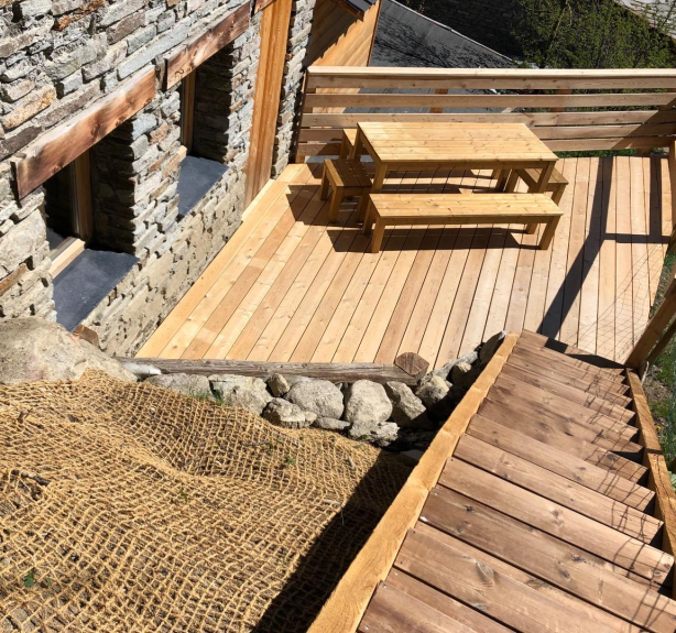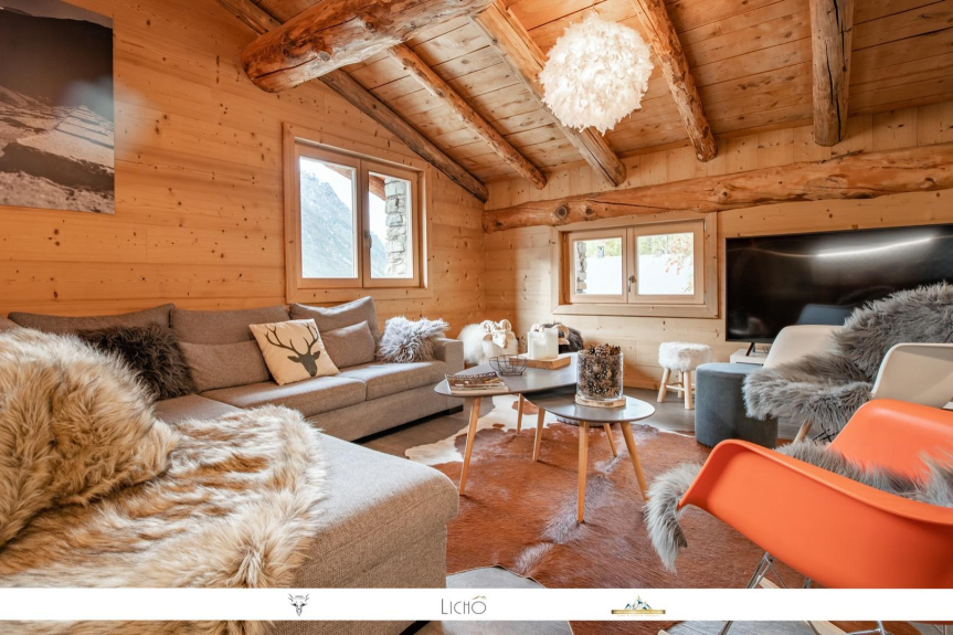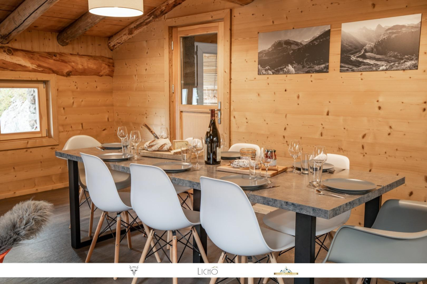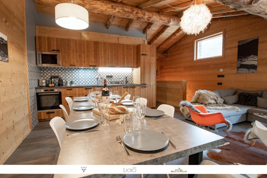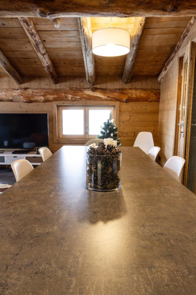 - Una zona giorno molto aperta di 40 m² con la struttura a vista dello chalet e una magnifica vista sulle montagne, con accesso alla terrazza esterna con tavolo, panche e sdraio.