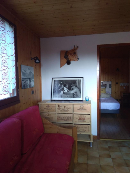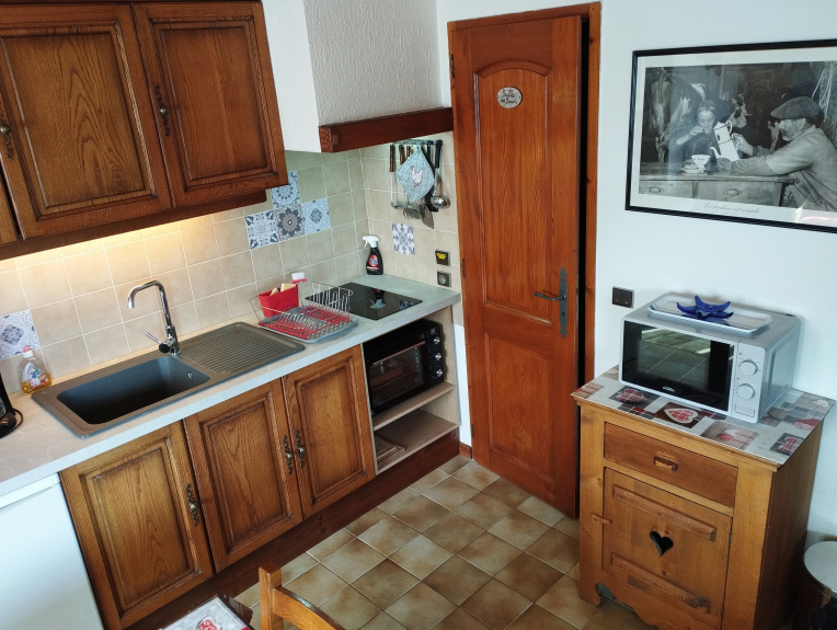 Vicino alle piste, grazioso piccolo appartamento di 29m2, per 4 persone, 1 camera con un letto matrimoniale e un soggiorno con un angolo cottura completamente attrezzato: divano letto per 2 persone, cucina elettrica e forno, forno a microonde, TV, un bagno con WC e vasca.