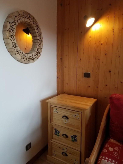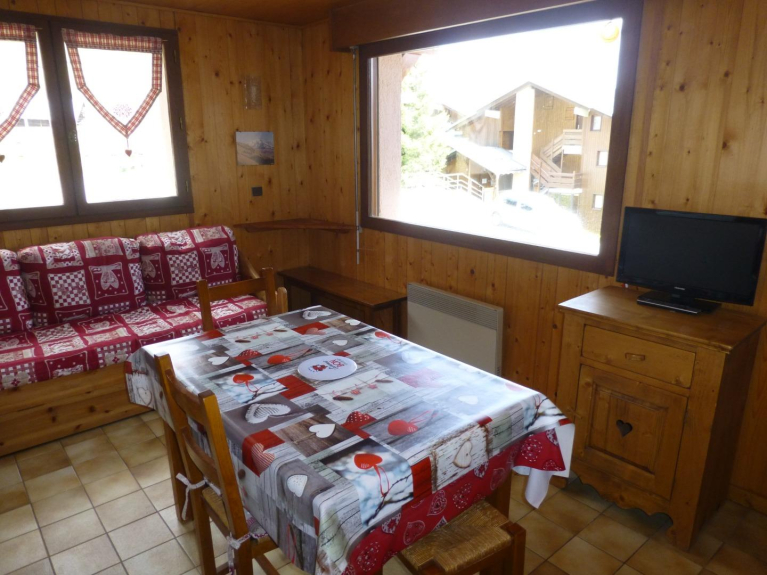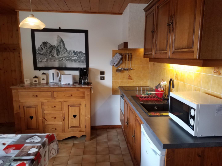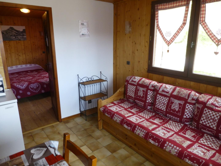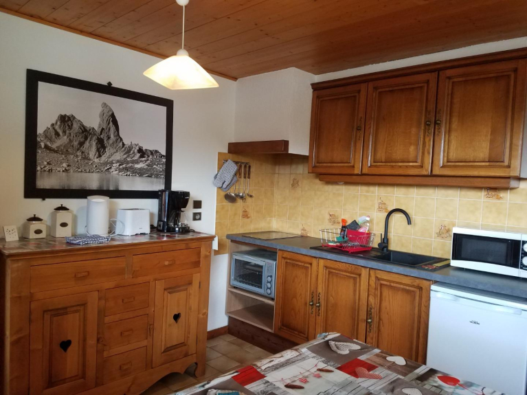 Affascinante piccolo appartamento in uno chalet di 29m2, per 4 persone, 1 camera con un letto matrimoniale e un soggiorno con un angolo cottura completamente attrezzato: divano letto per 2, cucina elettrica e forno, microonde, TV, un bagno con WC e doccia.