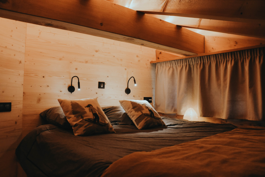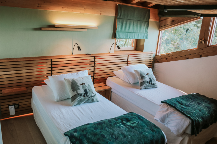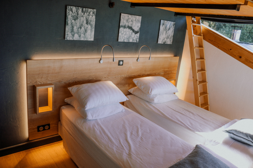 Camera 2: 1 letto matrimoniale 180 x 200 (2 x 90) + 1 letto matrimoniale 140 x 190 su un soppalco aperto.