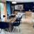Un grande soggiorno/sala da pranzo con cucina aperta e camino centrale