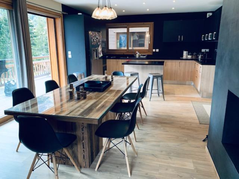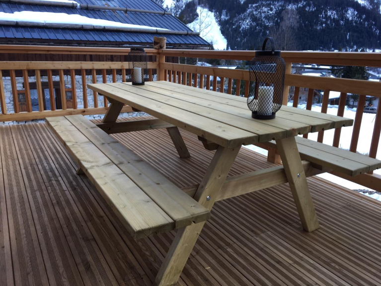 Chalet individuale esposto a sud con grande terrazza con vista panoramica sul villaggio e sulle montagne.