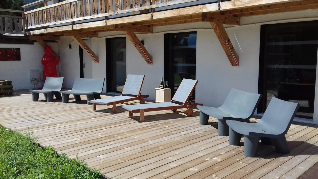 La terrazza si trova ai piedi del Monte Bianco e corre nell'erba del giardino.