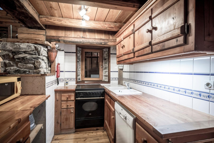 Cucina ben attrezzata aperta sul soggiorno. Macchina da raclette e set da fonduta.