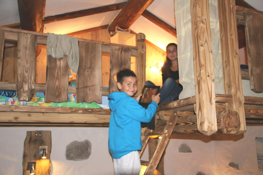 Sistemazione dei letti : 1 letto 140 e 1 letto 80 in mezanine (attenzione alla scala ripida da salire e vietata ai bambini molto piccoli, e altezza del soffitto ridotta 40 a 120 cm). Più 1 camera da letto con un letto da 140cm nel seminterrato (altezza del soffitto 170cm) con un grande armadio. Possibilità di un letto supplementare in aggiunta, ma lo spazio generale diventa davvero problematico con più di 5 persone.
