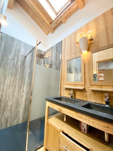 * 1 cucina completamente attrezzata che si apre sul soggiorno (piano Falcon 90 con 5 fuochi a gas e forno XXL, 2 microonde, lavastoviglie, grande frigorifero-congelatore, salamandra, Cook Expert XL Magimix, 2 macchine per raclette, 2 macchine per fonduta, crêpes, pentola a pressione, casseruole in ghisa...).