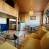 Soggiorno con TV a schermo piatto, una zona soggiorno con divano, una zona pranzo e uno spazio di archiviazione.
