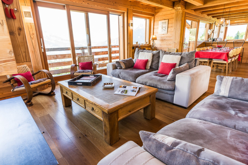 Al piano principale si trova un ampio salone con un bellissimo camino contemporaneo. Ideale per le serate di lettura di uno dei libri proposti, per navigare in internet o per guardare la televisione. Una sala da pranzo occupa l'altra parte del piano, vicino alla cucina. Aperta sul soggiorno, è dotata di tutte le attrezzature necessarie per preparare i piatti tradizionali savoiardi: fonduta, raclette, pierrade, ecc....
