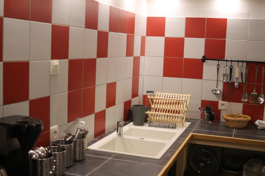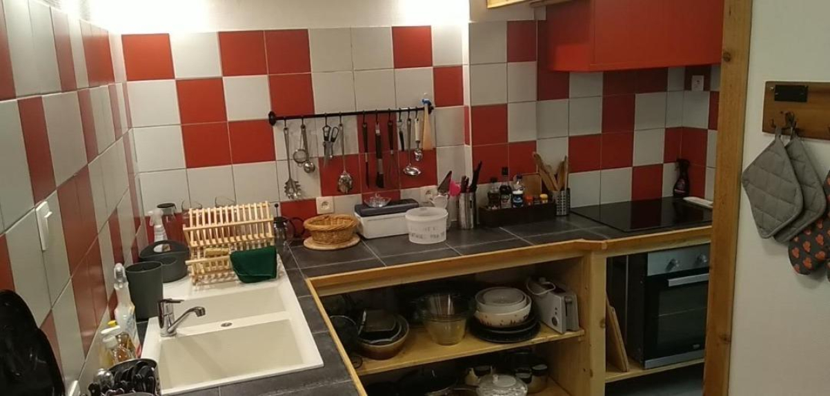 Zona cucina con lavastoviglie, frigorifero, congelatore, piano cottura a induzione, forno elettrico, microonde, vari piccoli elettrodomestici.
