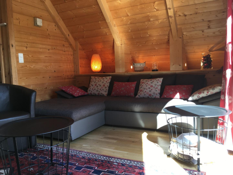 Un mezzanino chiuso che permette di dormire a due bambini sovrasta il soggiorno.