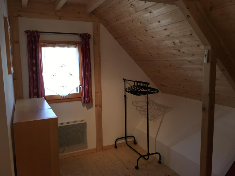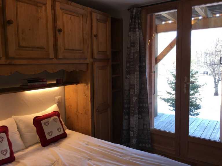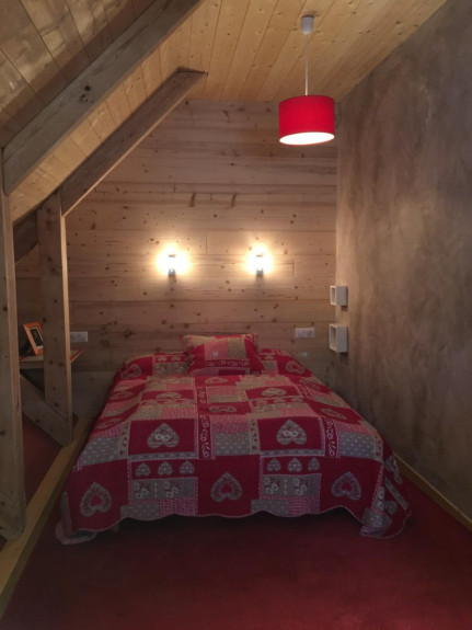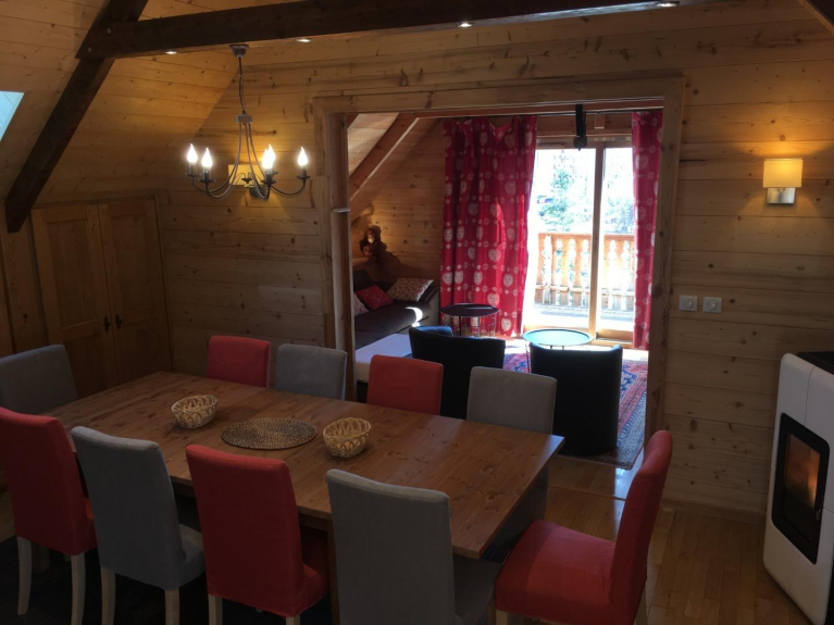 Costruito su due livelli, lo chalet comprende al 1° piano terra un ingresso con guardaroba, poi una camera da letto con un letto matrimoniale e un bagno e WC separati. Sullo stesso livello c'è una grande zona giorno con cucina, sala da pranzo e soggiorno con TV. Un balcone vi permette di pranzare con vista sulle montagne circostanti e sulle famose Aiguilles d'Arve.