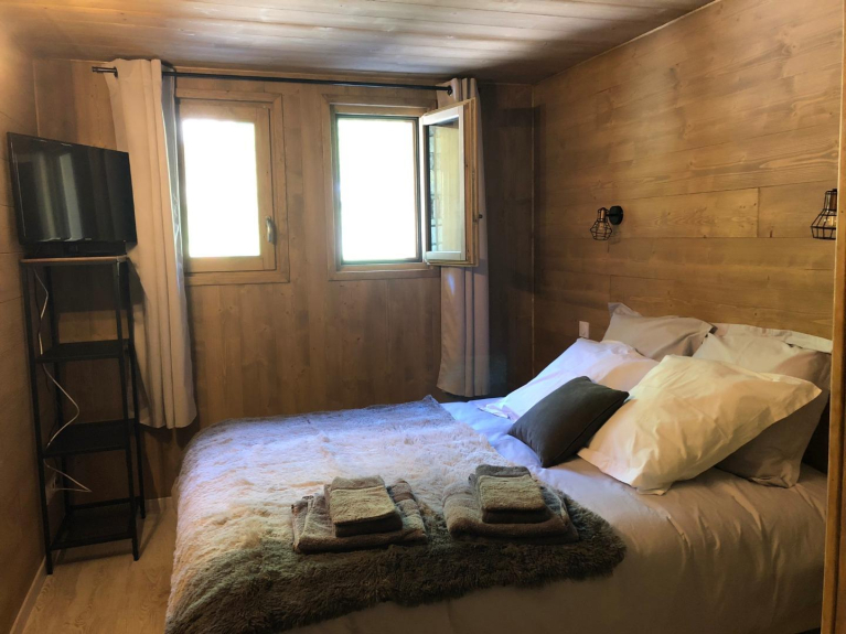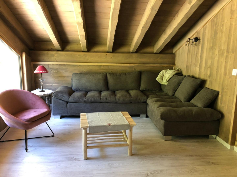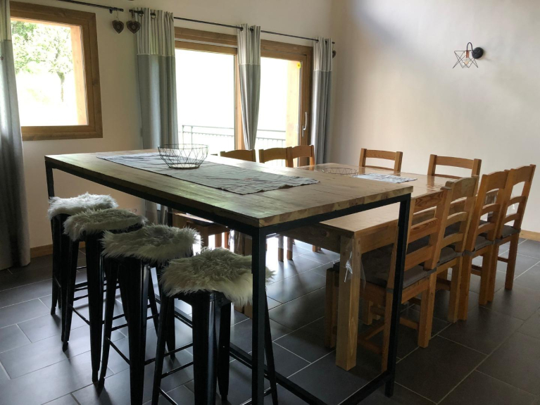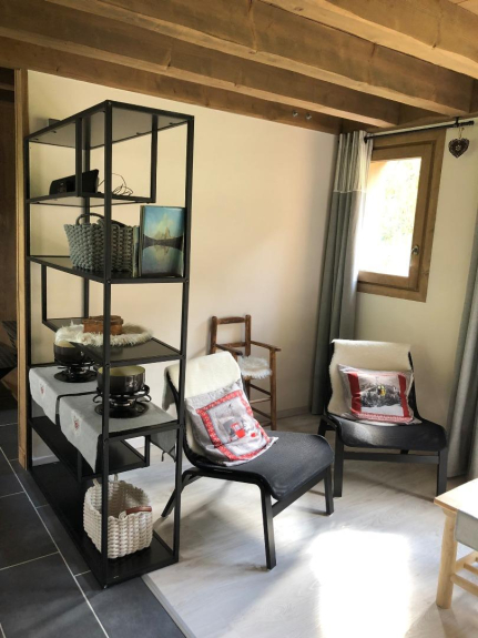- Soggiorno con cucina completamente attrezzata (forno, microonde, lavastoviglie, caffettiera a filtro, caffettiera Dolce Gusto, piano cottura a induzione, frigo-congelatore, raclette, padelle per fonduta, ecc.