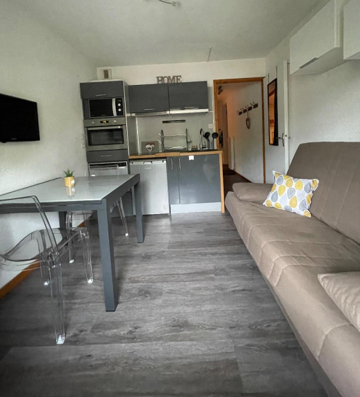 -1 soggiorno con una cucina funzionale dotata di forno, microonde, lavastoviglie, piano cottura a induzione e frigorifero. C'è un tavolo per 2 o 4 persone. Un televisore