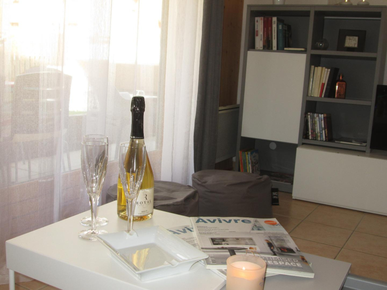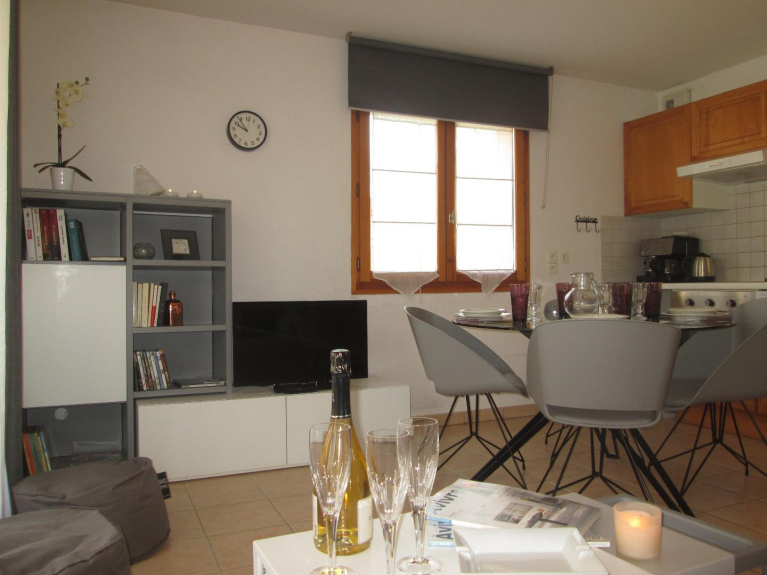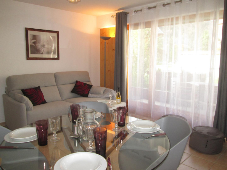- Soggiorno con cucina integrata (lavastoviglie, piano cottura, forno, microonde, frigo-congelatore, robot da cucina, macchina per caffè espresso, raclette e fonduta...),
