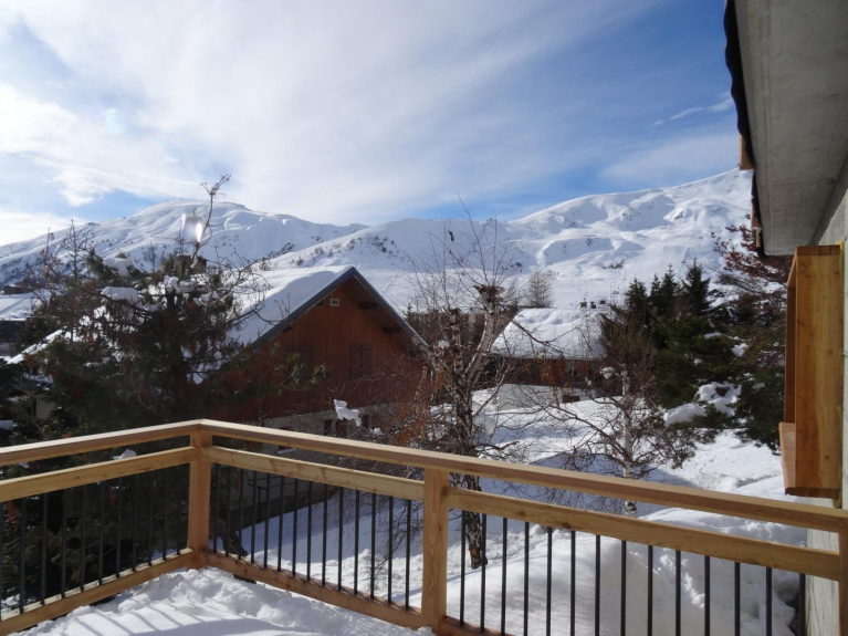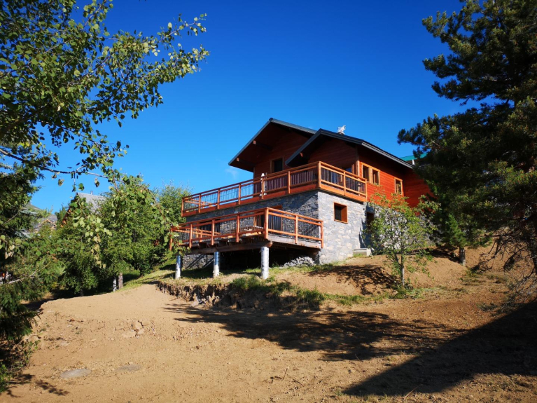 Esposto a sud, vista sulle Aiguilles d'Arves con grande terrazza con tavolo, panche e ombrellone.