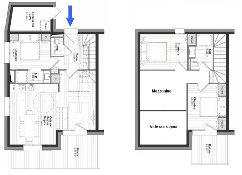 Superficie: 83m² (di cui 10m² sono meno di 1,80m) + 2 balconi esposti a sud: 11m² e 5m² + deposito sci: 4,5m².