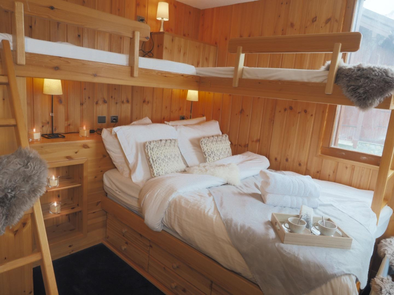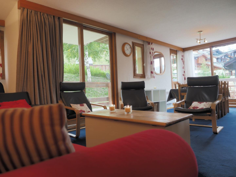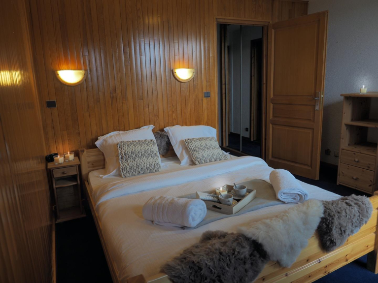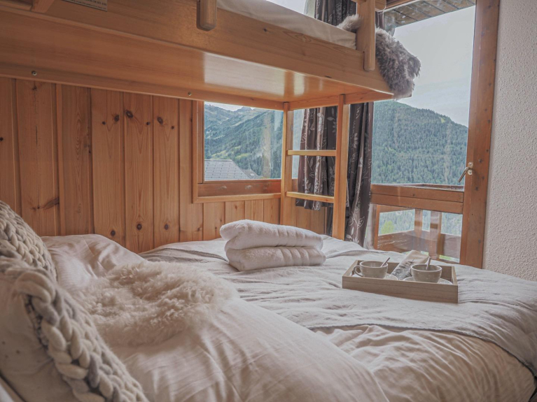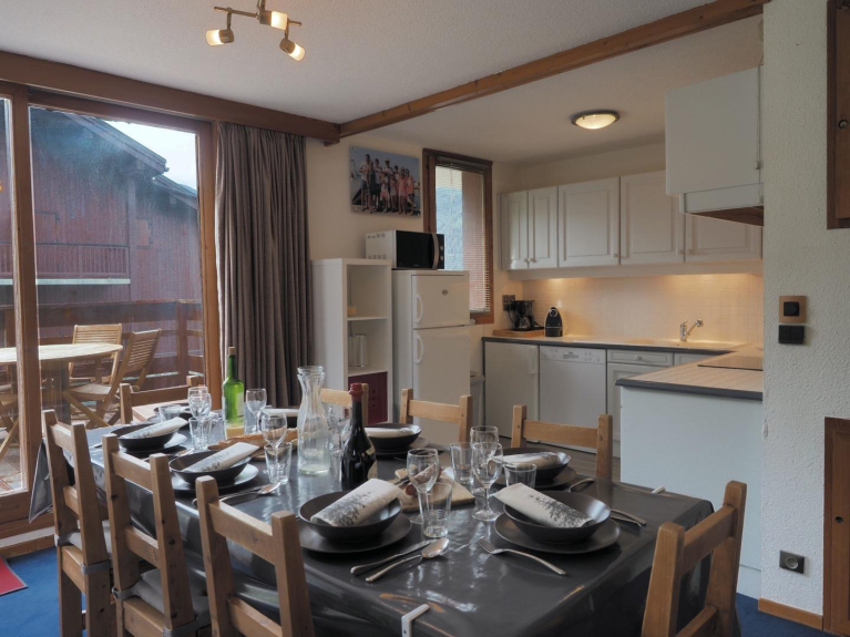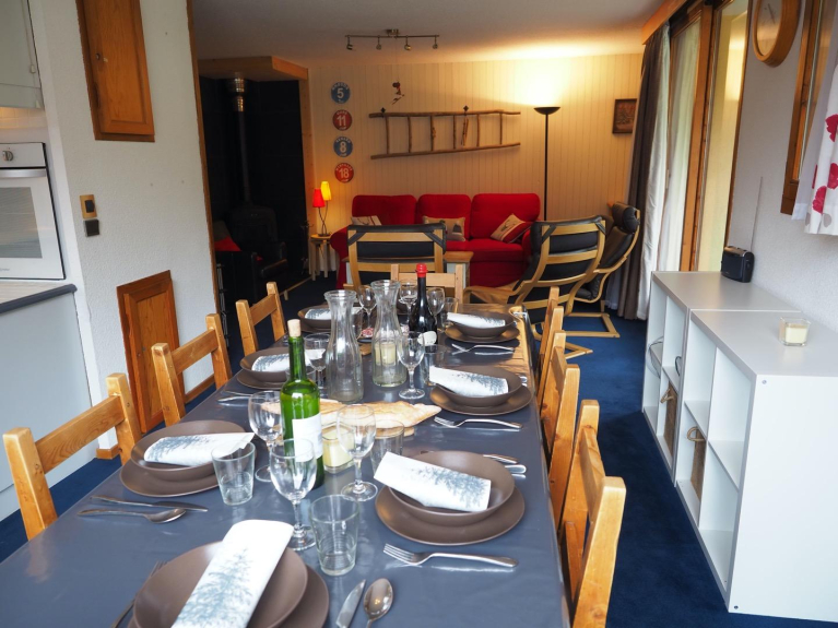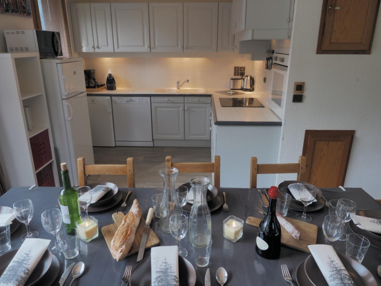 Questo grande appartamento può ospitare fino a 10 persone ed è ideale per famiglie numerose e/o gruppi di amici. La zona giorno è spaziosa e molto luminosa grazie alla sua grande terrazza che offre una magnifica vista sulle montagne di La Plagne. Ha un grande soggiorno aperto alla cucina, completamente rinnovato e ben attrezzato, con un divano letto a tre posti e diversi posti a sedere. Un tavolo da pranzo per 8 persone se volete avere ospiti!