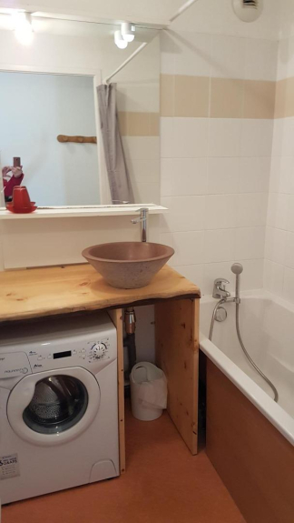 Ha un bagno con lavatrice, asciugacapelli, un bagno con doccia e WC separato.