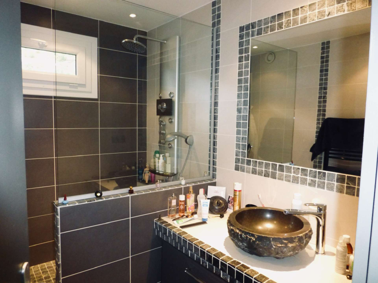 Bagno con doccia (4 m²) con asciugacapelli. WC separato.