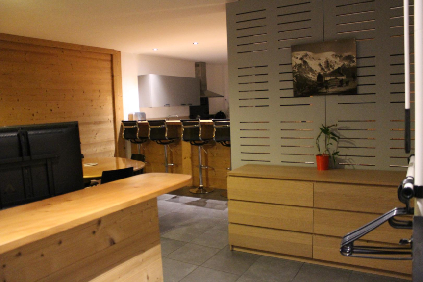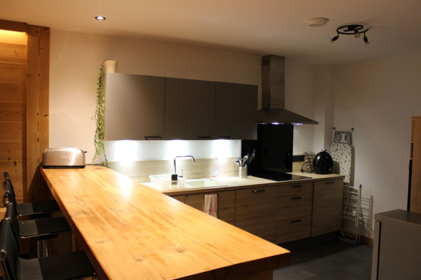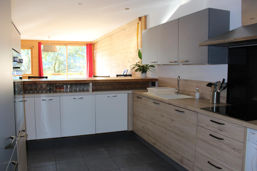 Grande cucina aperta completamente attrezzata: lavastoviglie, lavatrice, microonde, forno, congelatore, macchina per il caffè, bollitore elettrico, tostapane, raclette, macchina per la fonduta.