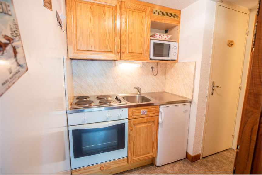 Zona cucina: piano cottura elettrico, forno, microonde, frigorifero e tutte le stoviglie e posate