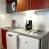 Zona cucina: piano cottura elettrico, forno combinato, frigorifero, lavastoviglie e tutte le stoviglie e posate
