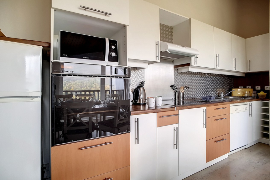 Cucina in muratura molto grande con 4 piastre, frigorifero, forno tradizionale, forno a microonde, cappa, lavastoviglie, bollitore, tostapane e macchina da caffè