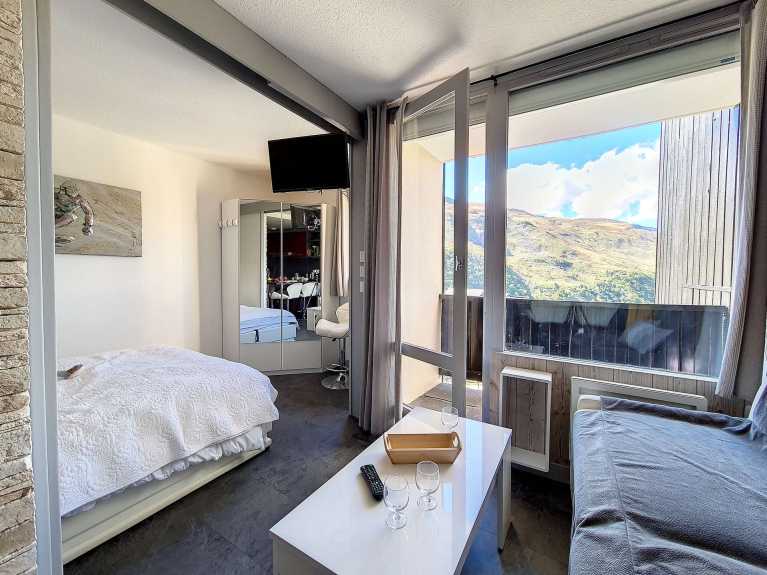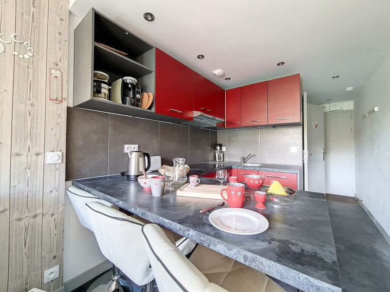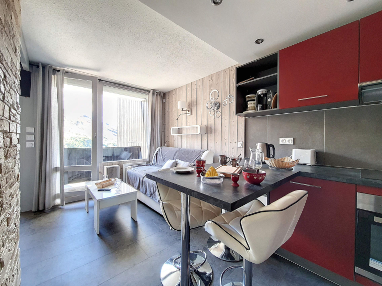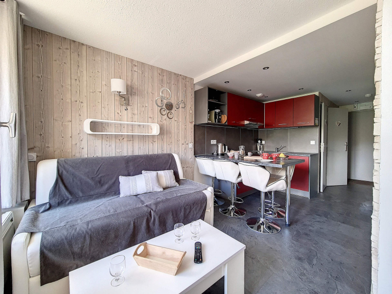 Stupendo appartamento completamente rinnovato di 27 m² con una zona notte chiusa e una cabina per 4 persone. Si trova al 5° piano e ha un balcone rivolto a ovest.