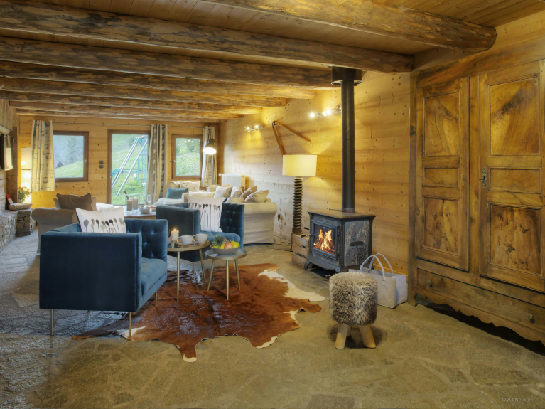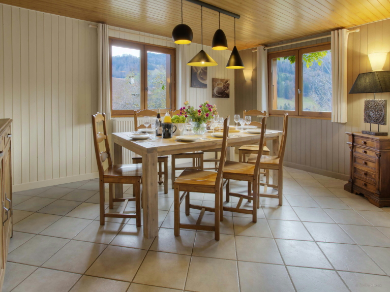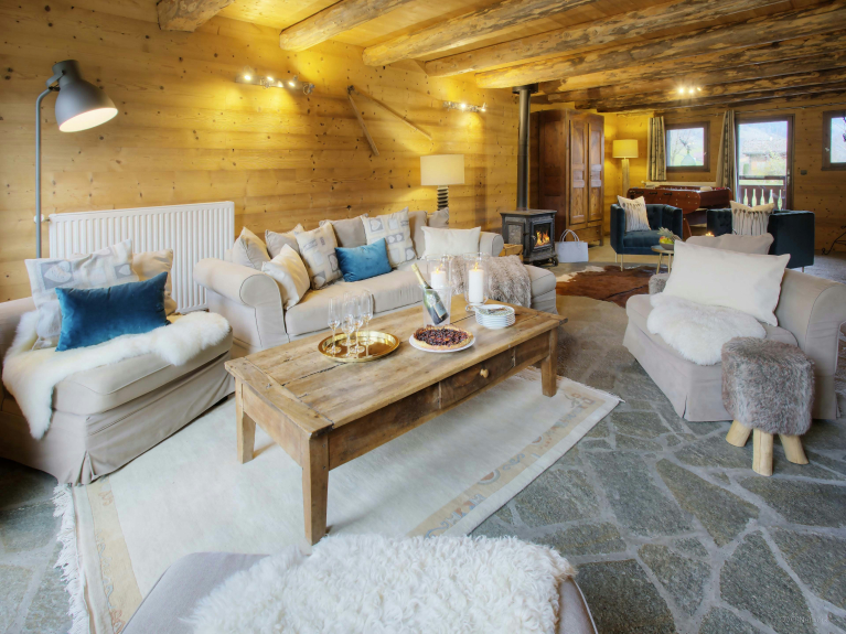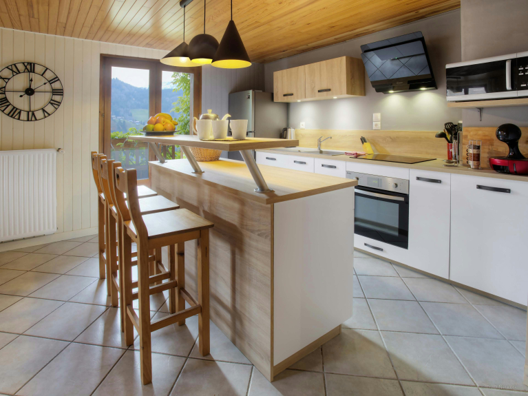 La grande cucina e la zona pranzo sono molto conviviali. Vi piacerà cucinare e mangiare insieme. Il soggiorno, che si estende per tutta la lunghezza dello chalet, è anche dotato di un grande tavolo. In questa stanza si possono trascorrere calde serate in comodi divani accanto alla stufa a legna, guardando un film o pianificando la prossima giornata in montagna.