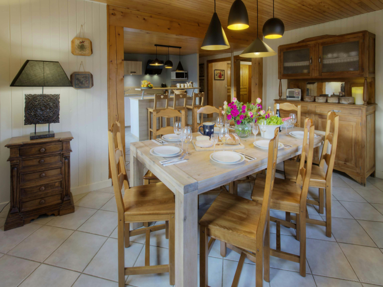 Su entrambi i lati della proprietà troverete terrazze riparate dove è possibile barbecue e cenare, o godere di un bagno nella vasca idromassaggio. Il balcone anteriore, ornato da una lunga vite e da un cespuglio di rose, offre una magnifica vista sulla catena montuosa degli Aravis.