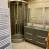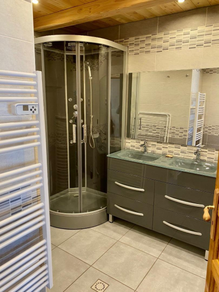 Bagno con doccia, doppio lavabo, asciugacapelli, portasciugamani,