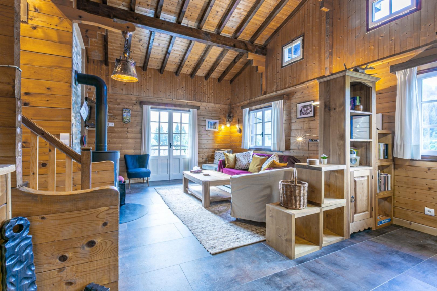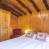 - Zona pranzo: grande tavolo e botola che porta alla cucina, finestra sud con vista sulla montagna + finestra est con vista limitata sugli abeti.