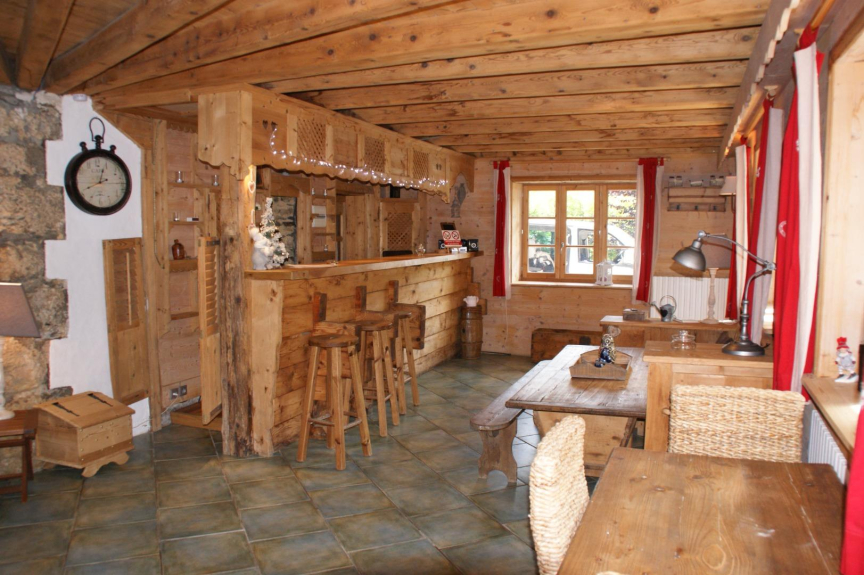- 1 grande soggiorno a forma di L con zona bar, zona salotto, sala da pranzo, stufa a legna. 1 toilette indipendente con lavabo.
