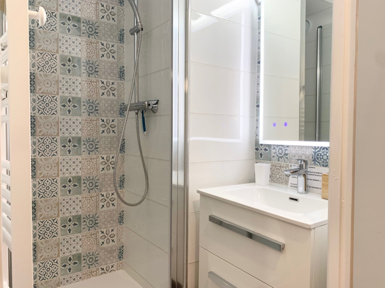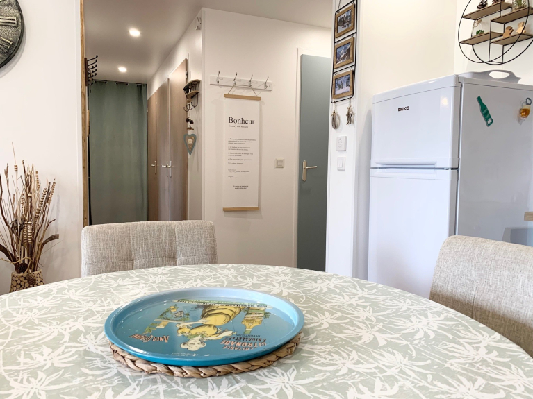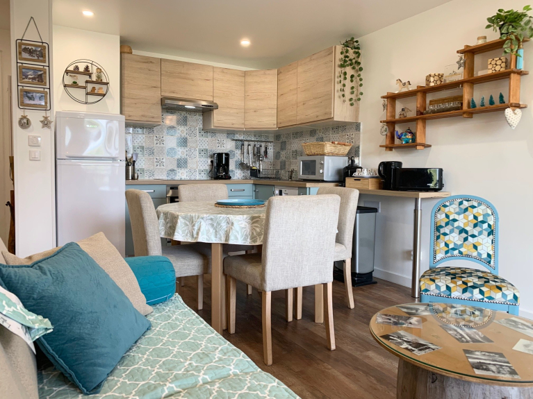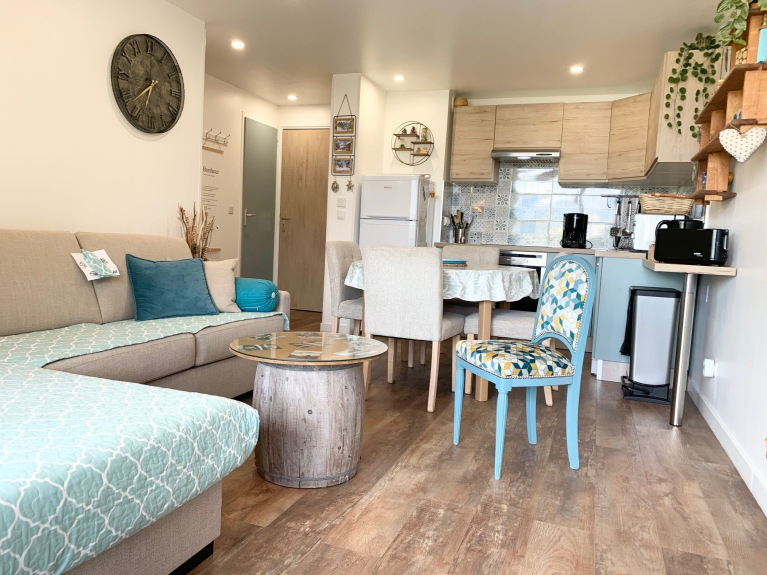 Cucina aperta sul soggiorno con divano letto matrimoniale, una camera matrimoniale e una camera doppia. Un bagno, un bagno con doccia. WC separato. Armadio per gli sci.