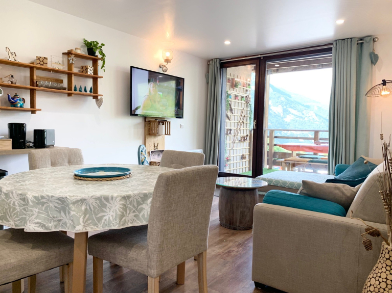 Appartamento 6 letti con balcone, vista sulla valle, negozi e piste nelle vicinanze.