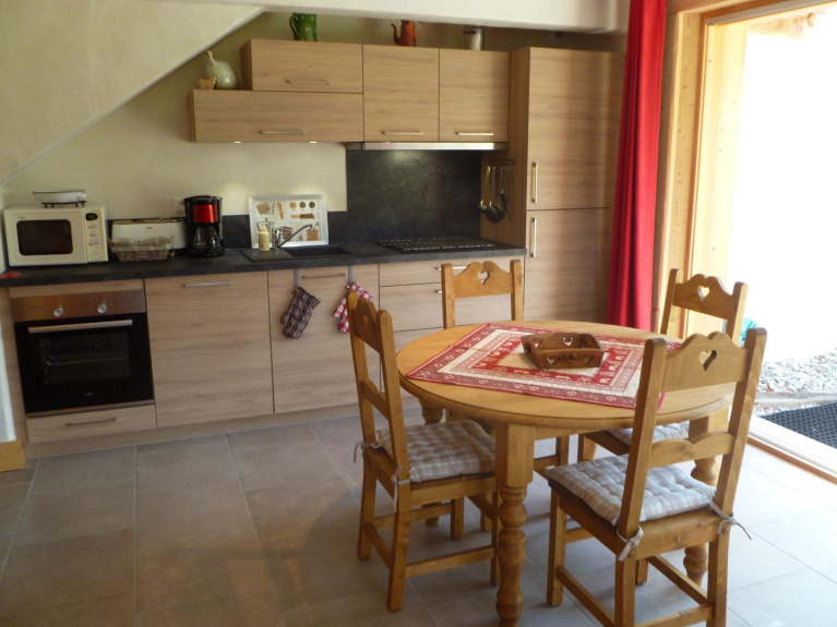 Appartamento affascinante, indipendente, con accesso diretto all'esterno. Molto ben attrezzata e ben decorata. Situato al piano terra di un bellissimo chalet del 2015. Parcheggio esterno e deposito sci esterno.